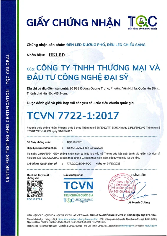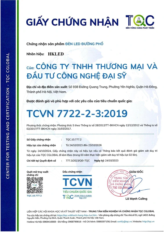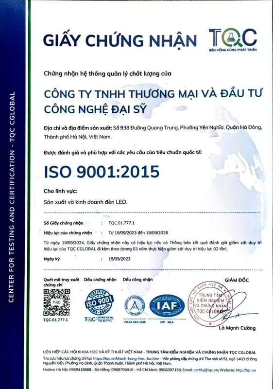 • Tiêu chuẩn: ISO 9001:2015, TCVN 7722-1:2017