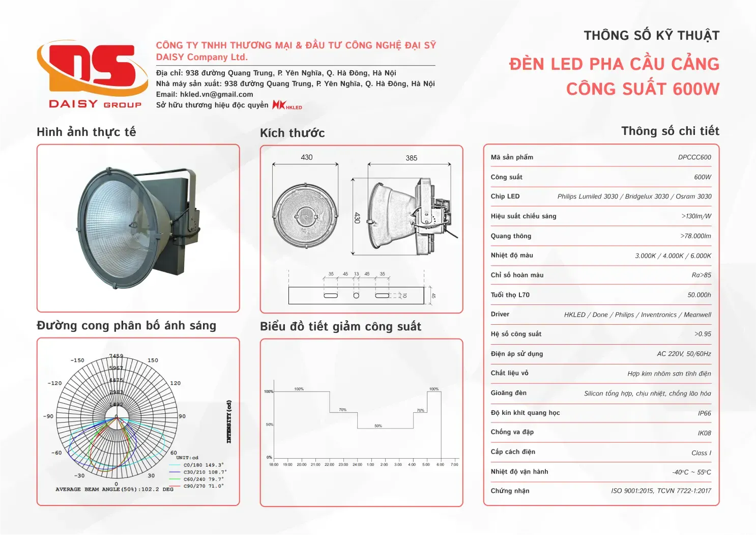 • Hiệu suất chiếu sáng: 130lm/W